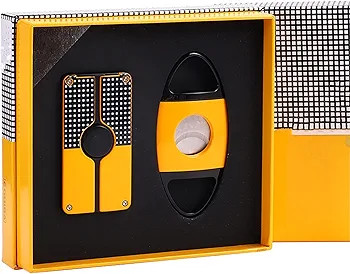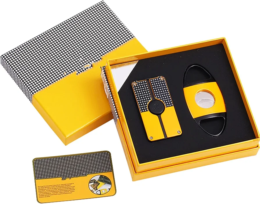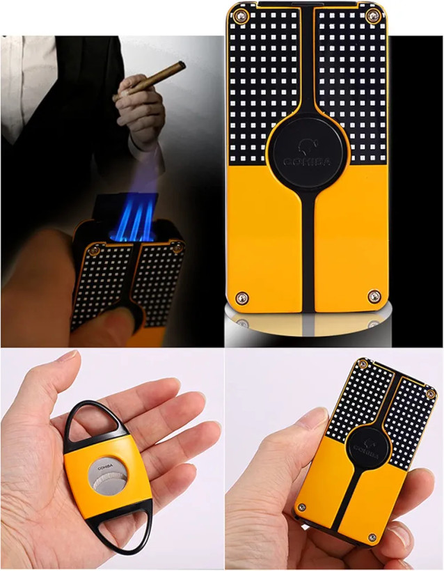 این محصول به ست لاکچری و خاص مخصوص سیگار برگ میباشد که جنس بدنه فندک و کاتر فلزی میباشد سه شعله همزمان هستش قیمت اصلی این محصول هشت ملیونو پونصد هزار تومن میباشد درب جعبه زیر باز فشار آمده و به شده جعبه اش به همین خاطر18درصد تخفیف گذاشته شده روی این محصول